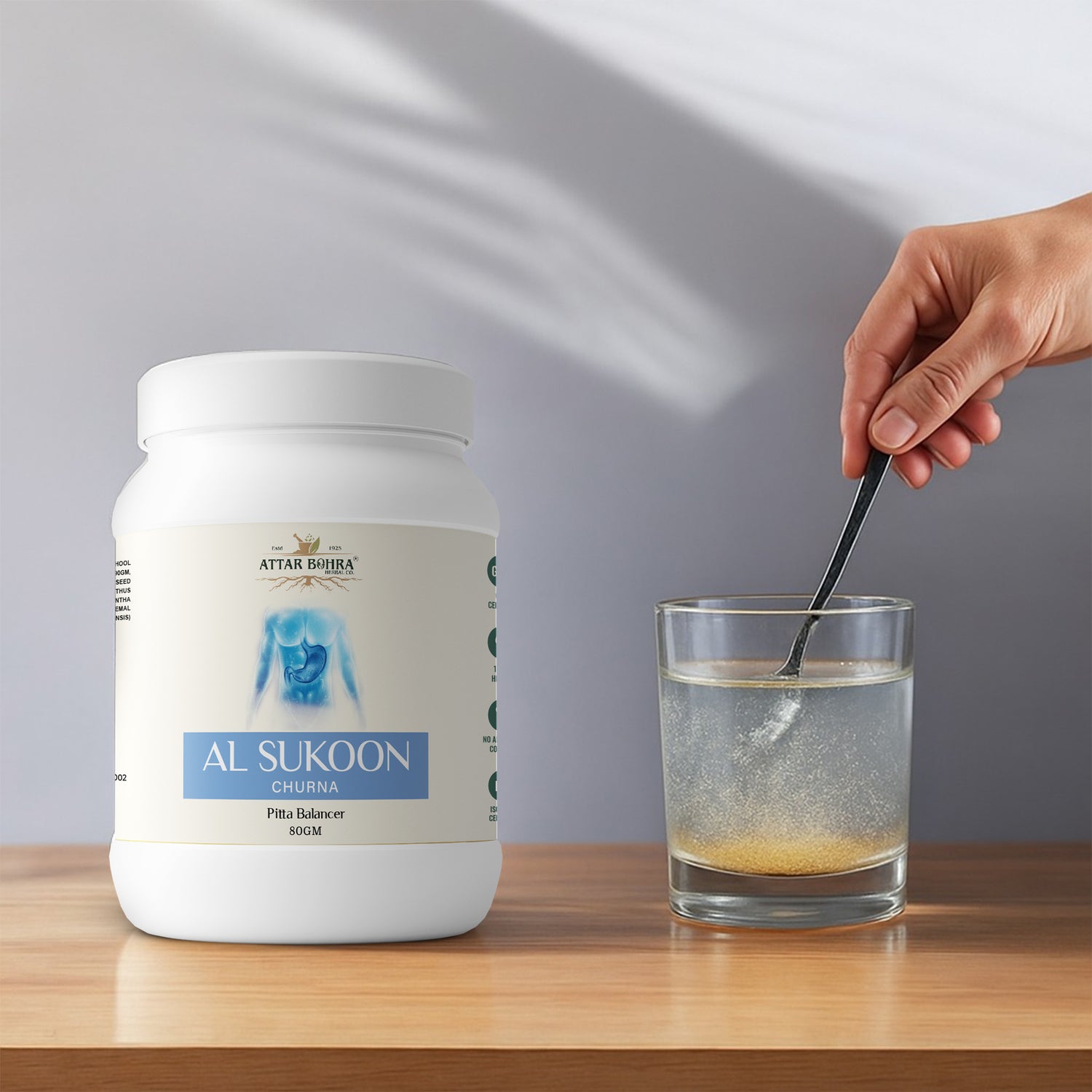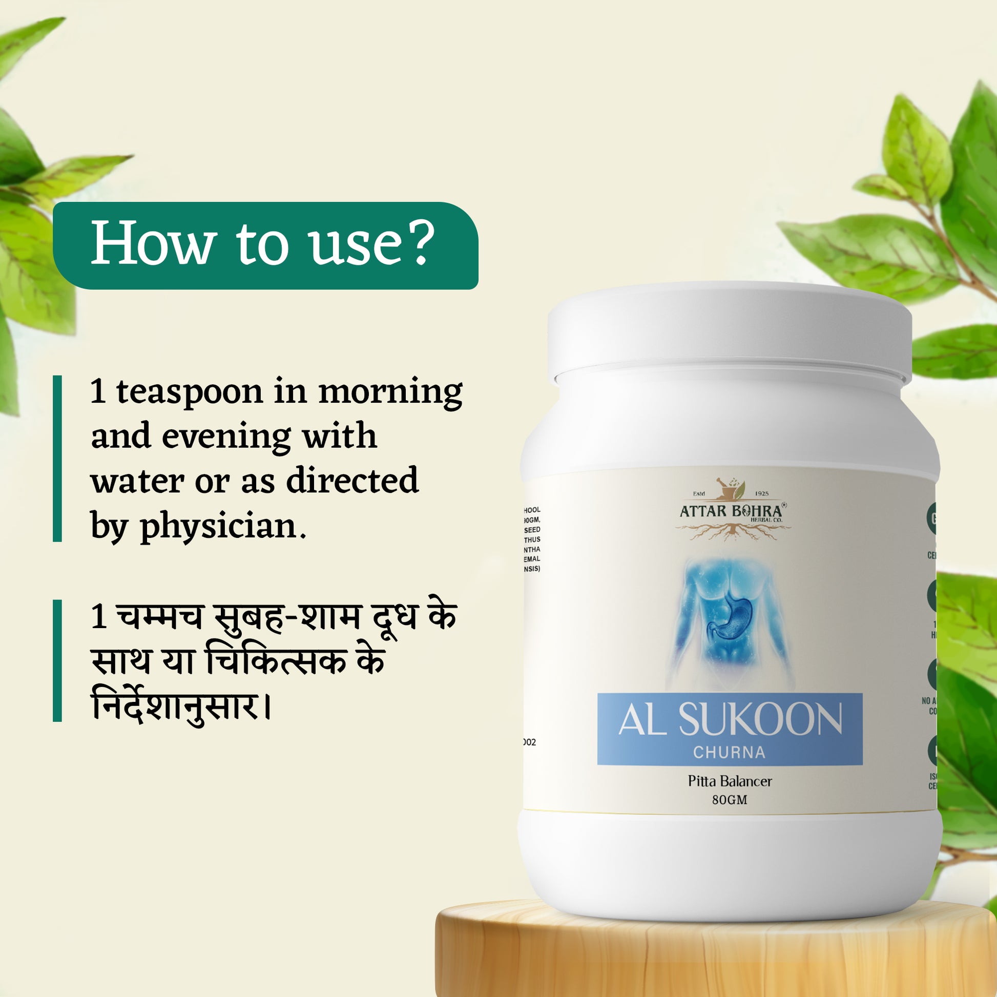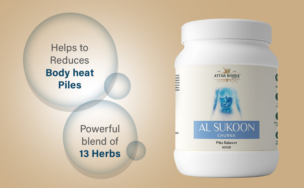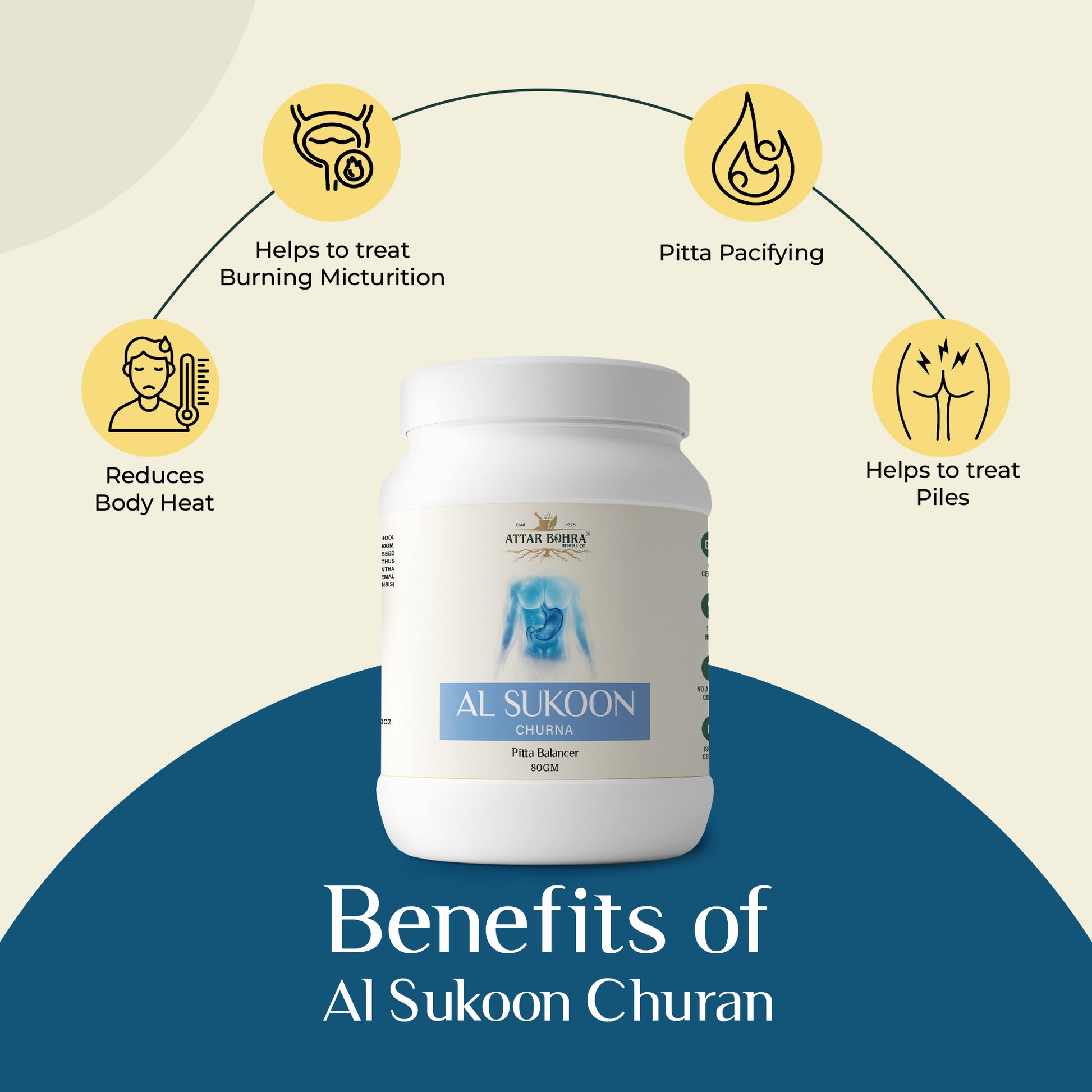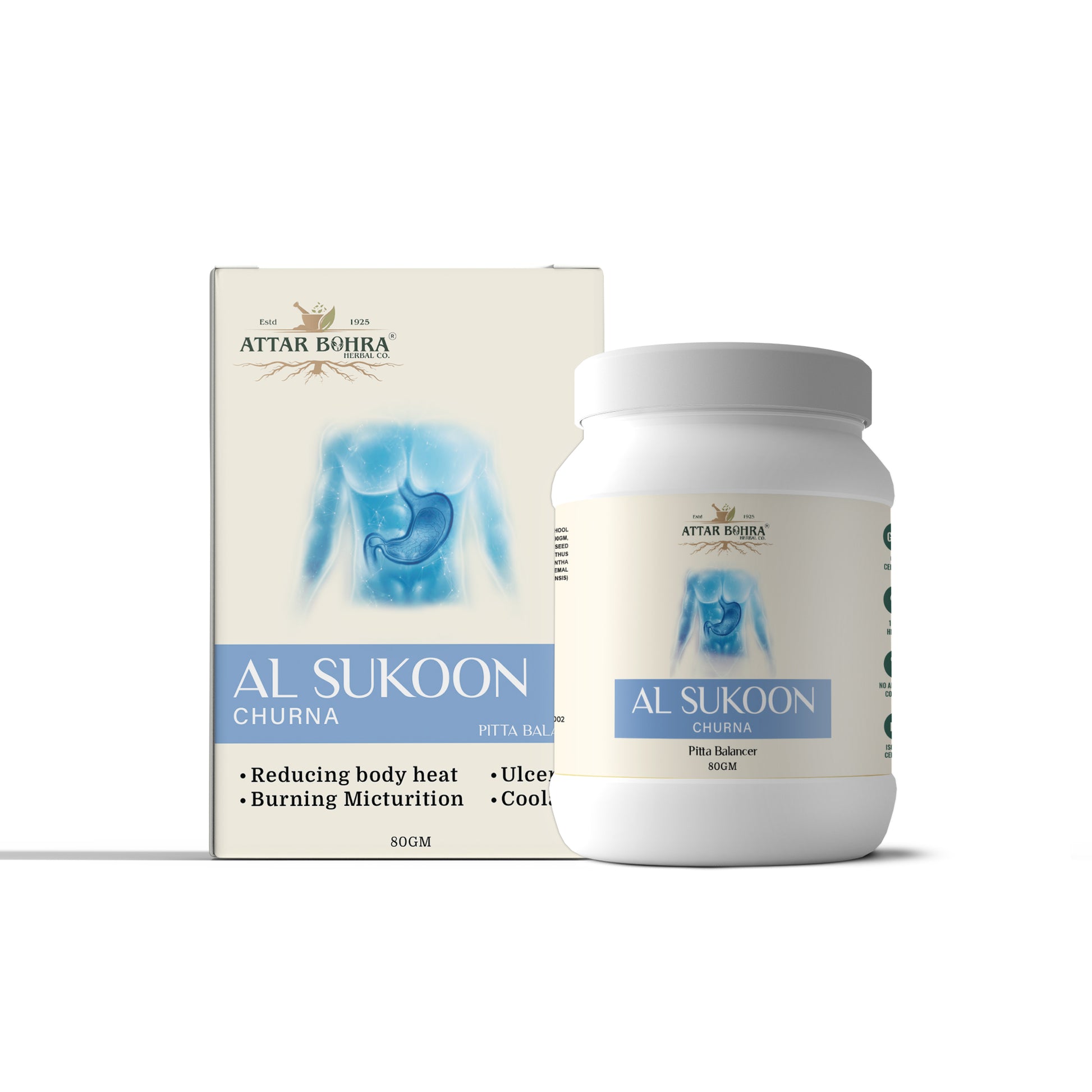 अल-सुकून चूरन, एक विशेष रूप से तैयार हर्बल मिश्रण है जो शरीर की गर्मी, पेशाब की जलन, पित्त दोष को शांत करने और बवासीर में जलन को कम करने के लिए बनाया गया है।