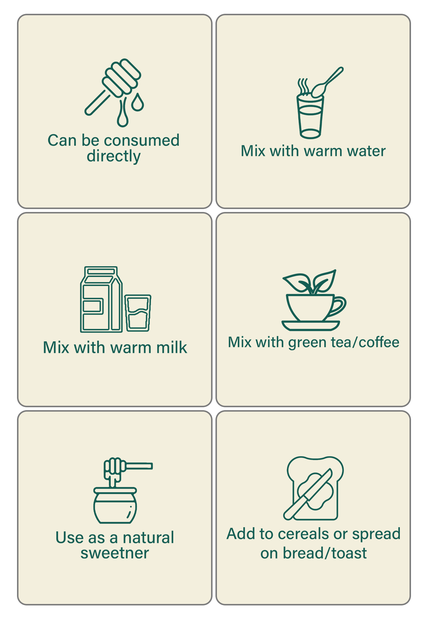 अपनी चाय में प्राकृतिक स्वीटनर के रूप में अत्तर बोहरा शहद का आनंद लें, इसे टोस्ट पर फैलाएं, दही के ऊपर छिड़कें, या अपने पसंदीदा व्यंजनों में एक प्रमुख घटक के रूप में इसका उपयोग करें।