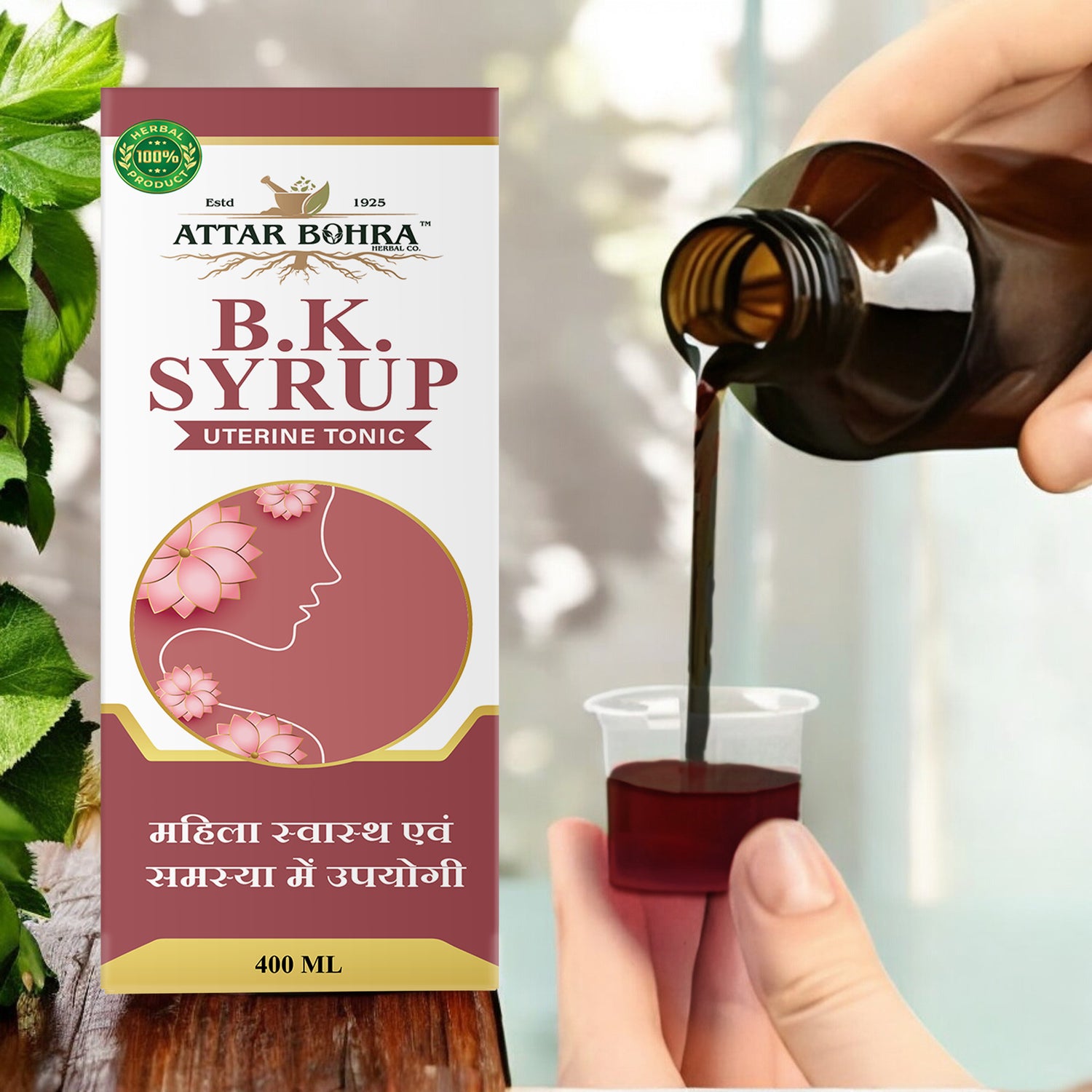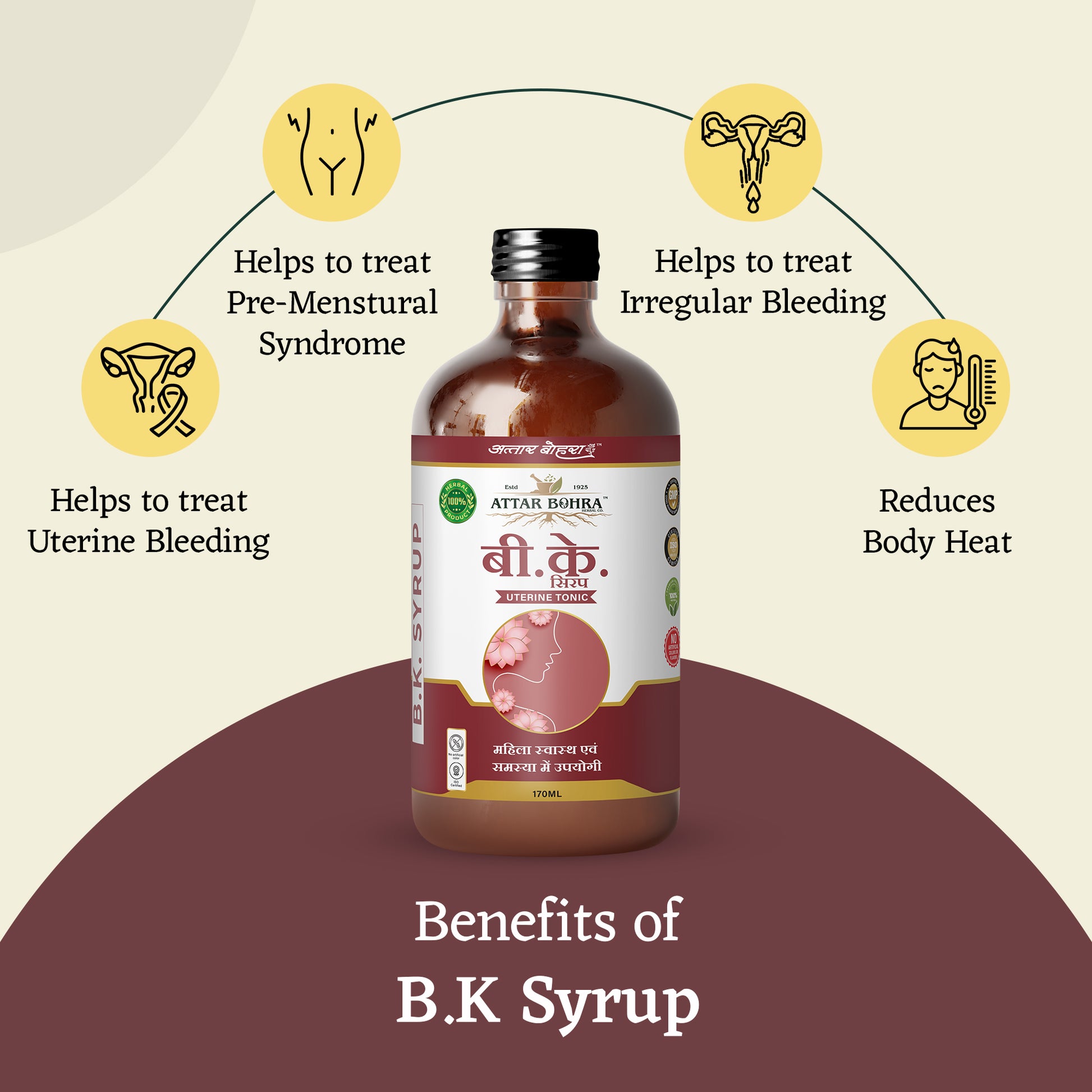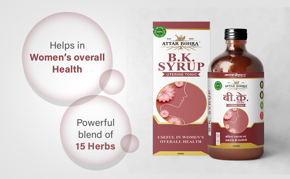 B.K Syrup, a specialized formulation designed to address common female health issues including uterine bleeding, pre-menstrual syndrome (PMS), irregular bleeding, and body heat.