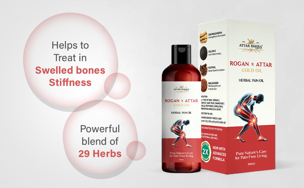 Relieve pain and stiffness with Rogan-E-Attar Pain Oil, a powerful Ayurvedic solution designed to alleviate sciatica, joint pain, and swollen bones. Using traditional Ayurvedic ingredients, this oil enhances mobility and provides natural, effective pain relief.