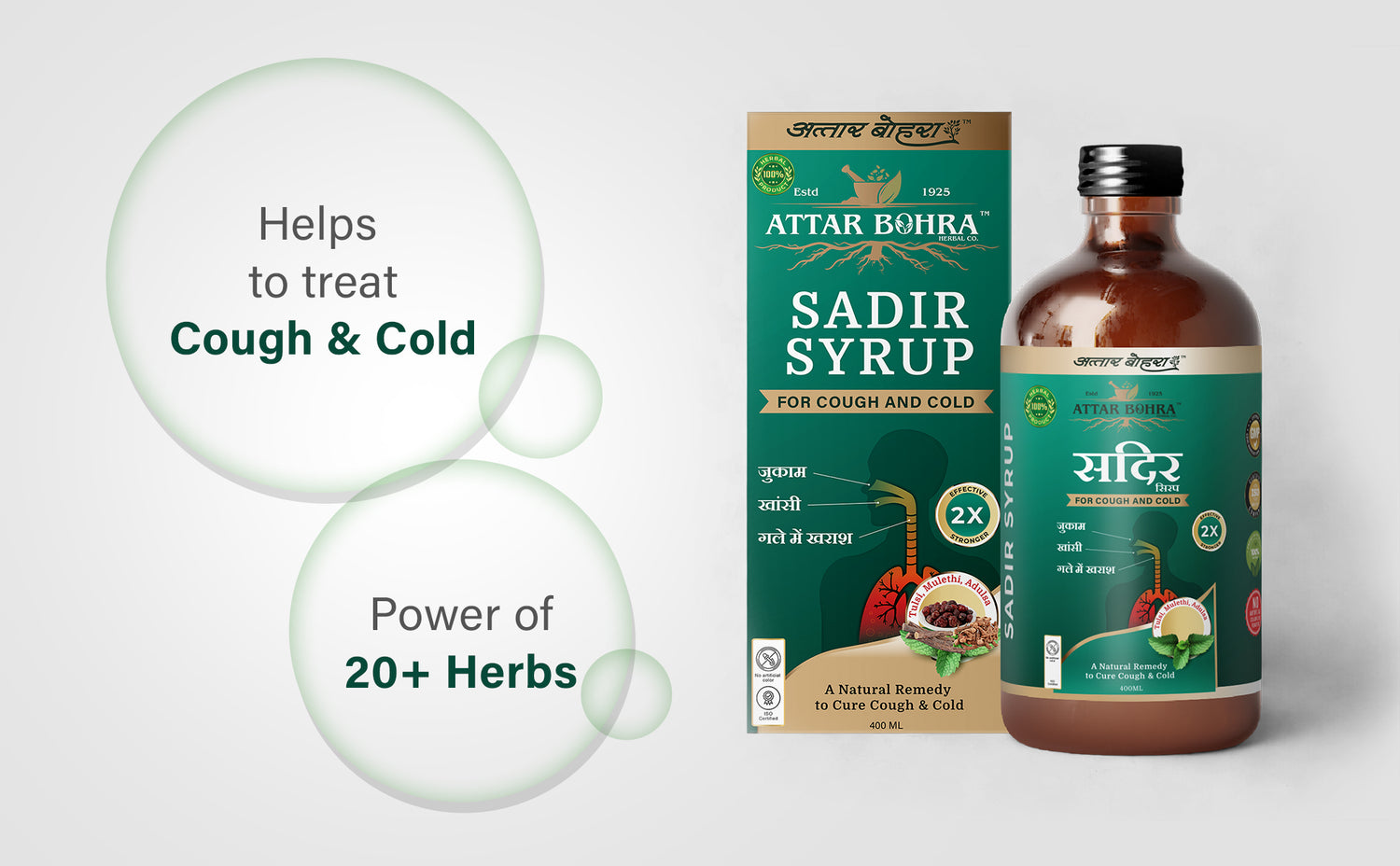 Find comfort and relief from seasonal ailments with SADIR Ayurvedic Syrup,A soothing blend of traditional herbs expertly formulated to address cough, cold, fever, and sore throat.Drawing on the time-tested wisdom of Ayurveda, SADIR offers a natural remedy to support your respiratory health and overall well-being.