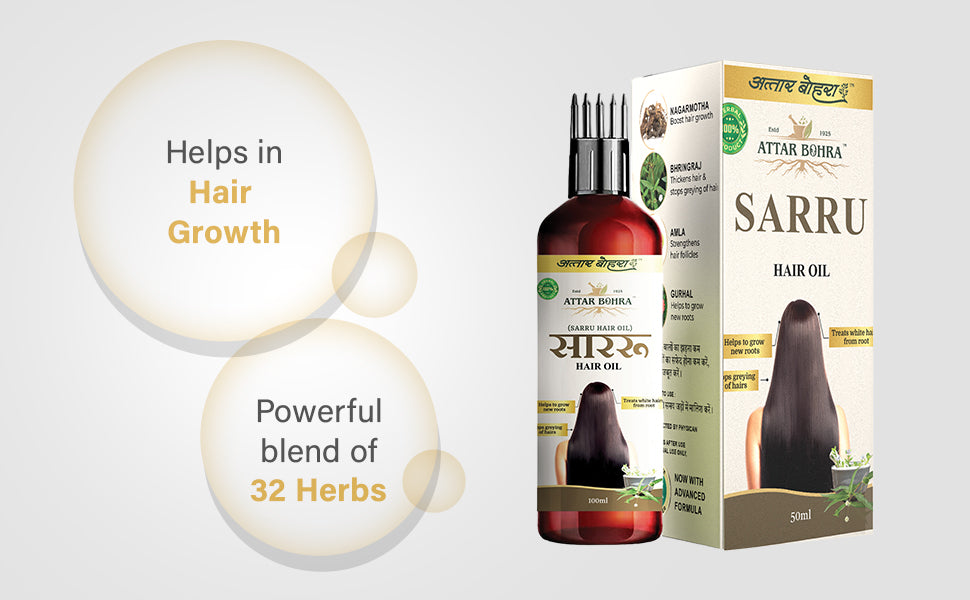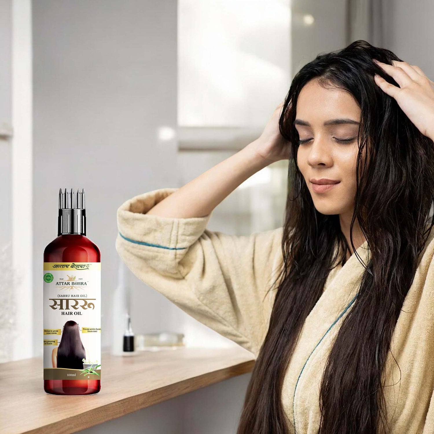 SARRU Hair Oil, an expertly crafted blend designed to address grey hairs, boost hair growth, and strengthen hair from the roots.